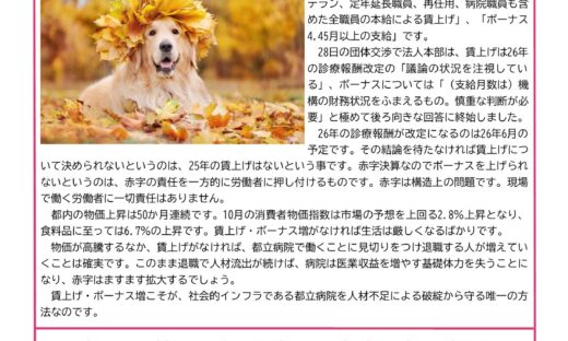 11月19日、都立病院労組は団体交渉終了後に拡大闘争委員会を開催、賃金・冬のボーナス等について妥結することを決定しました(主な妥結内容は下段参照)。