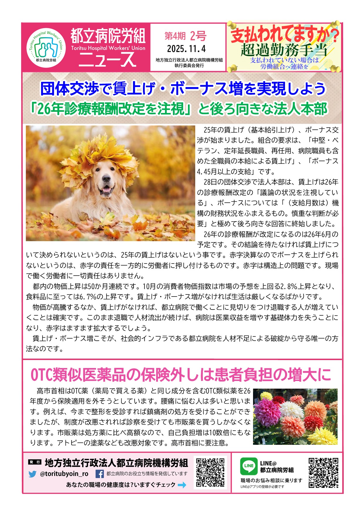 25年の賃上げ(基本給引上げ)、ボーナス交渉が始まりました。組合の要求は、「中堅・ベテラン、定年延長職員、再任用、病院職員も含めた全職員の本給による賃上げ」、「ボーナス4.45月以上の支給」です。