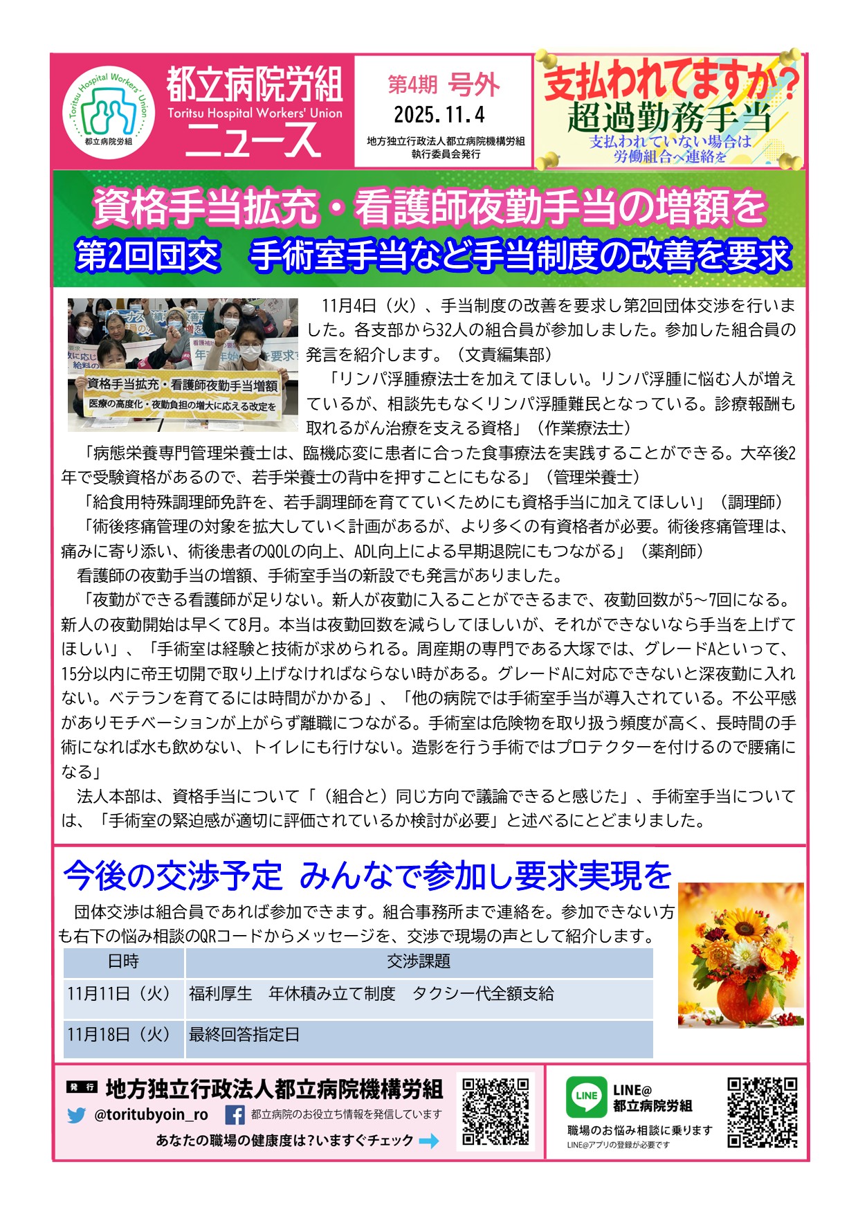 法人本部は、資格手当について「(組合と)同じ方向で議論できると感じた」、手術室手当については、「手術室の緊迫感が適切に評価されているか検討が必要」と述べるにとどまりました。
