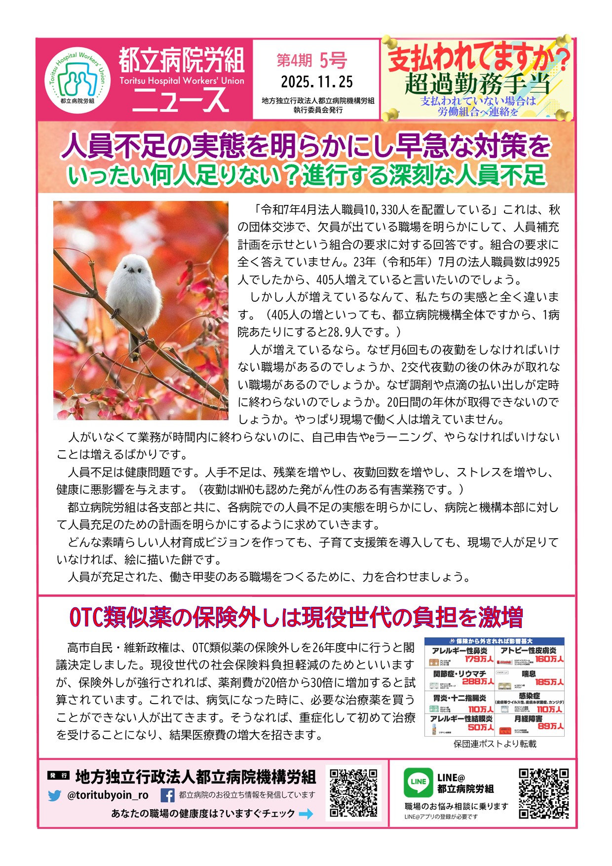 都立病院労組は各支部と共に、各病院での人員不足の実態を明らかにし、病院と機構本部に対して人員充足のための計画を明らかにするように求めていきます。