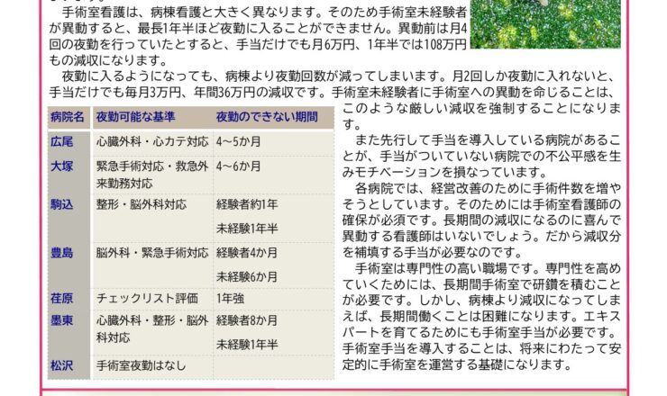 4月から手術室手当の導入を求めます。看護師の給料は夜勤手当が大きなウエイトを占めます。ところが手術室へ異動すると、表のように最低でも半年間程度夜勤...