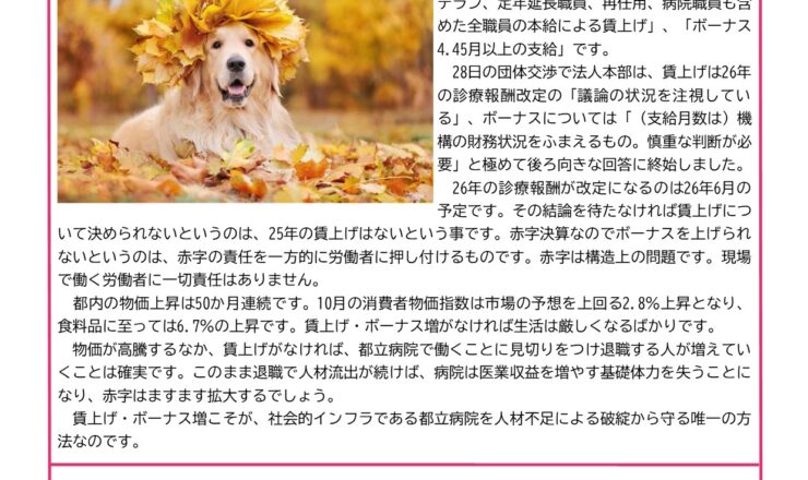 25年の賃上げ(基本給引上げ)、ボーナス交渉が始まりました。組合の要求は、「中堅・ベテラン、定年延長職員、再任用、病院職員も含めた全職員の本給によ...