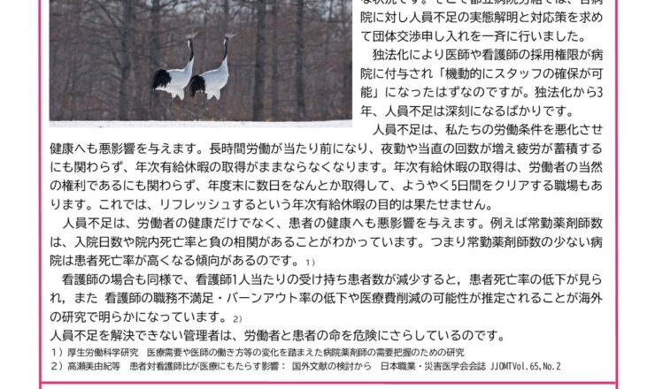 人員不足が深刻です。人員が充足している職場は果たしてあるのだろうか?というような状況です。そこで都立病院労組では、各病院に対し人員不足の実態解明と...