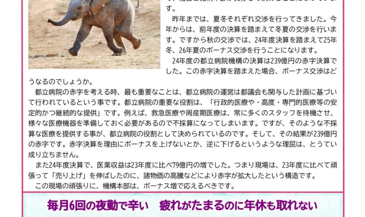赤字決算でも医療収益79億増 収益増にはボーナス増 79億収益増を生み出したのは私たち現場です 私たちには、昨年を上回る4.45月以上のボーナスが必要です。 ボーナスは都立病院機構の経営を踏まえたうえ... 夜勤 2025.10.03