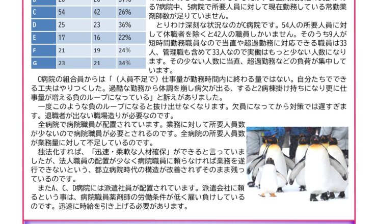 人員不足が深刻です。人員が充足している職場は果たしてあるのだろうか?というような状況です。そこで都立病院労組では、各病院に対し人員不足の実態解明と...